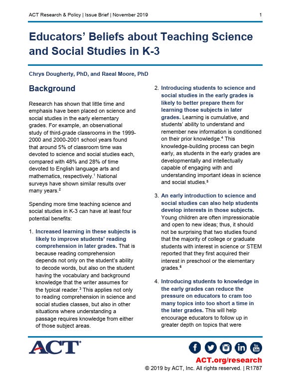 The ACT issue brief linked above also identifies four possible benefits for teaching science and social studies in early elementary classes: