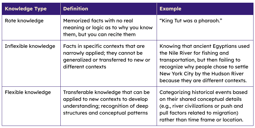 We store knowledge as schemas in our long-term memory. Schemas are deep conceptual frameworks. For example, a schema for “settlements” might include knowledge and related thinking skills about access to water, migration, building and creation, innovation and risk-taking, leadership, and collaboration.
