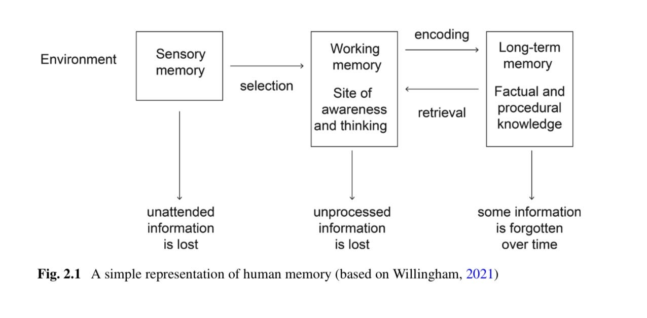 Working memory and long-term memory interact to draw on stored knowledge (schemas) to interpret new inputs and encode new knowledge.